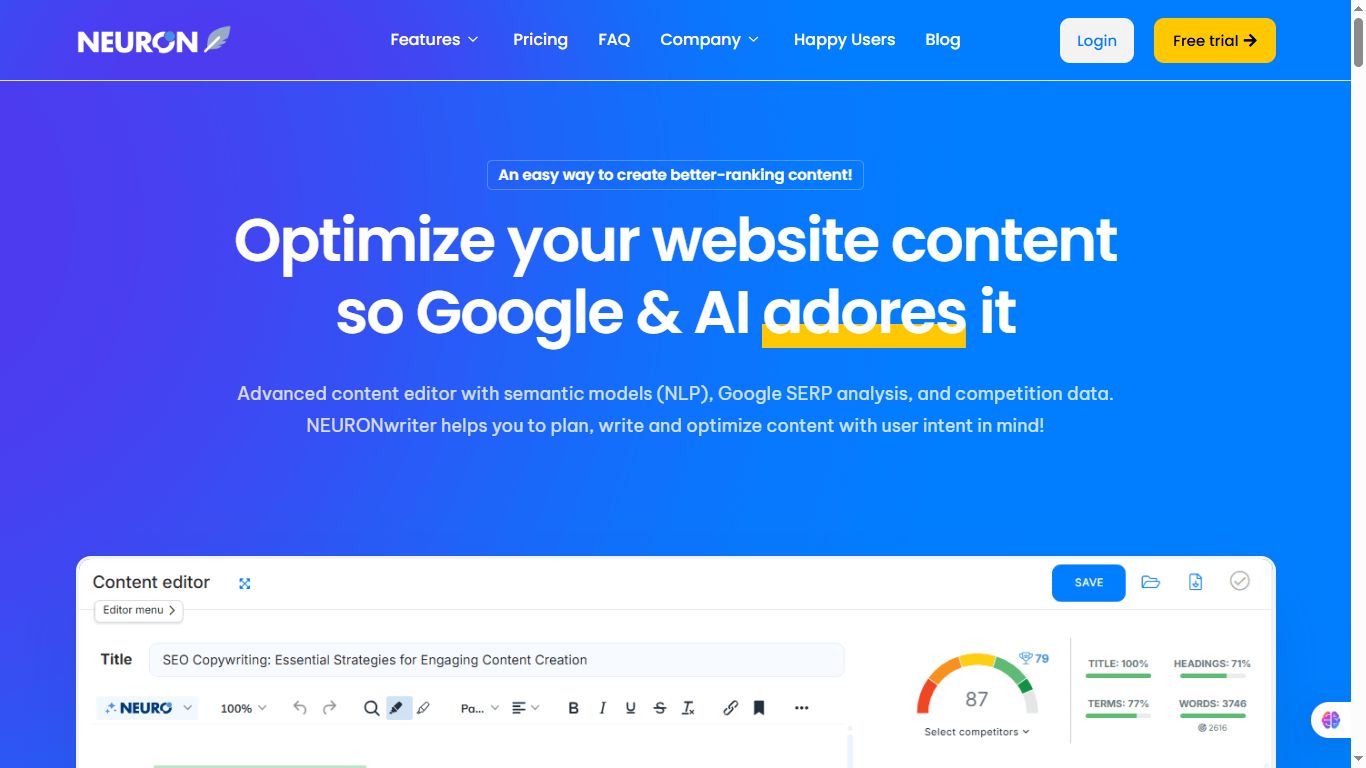 NeuronWriter (launched 2021, used by 50,000+ content creators) combines NLP analysis with real-time SERP data to build content that actually ranks. So no, it doesn’t just show keywords. It analyzes top 30 results for any keyword, extracts semantic terms and content structure, then guides you through writing optimized content—with a live content score that updates as you write.