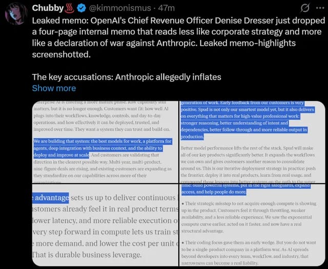 OpenAI’s CRO Denise Dresser criticized Anthropic in an internal memo, calling its reported $30B run rate misleading and positioning it as a weaker player in the platform race.